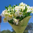 Уменьшенный: хризантема кустовая ромашковая - 3 шт, фрезия/альстромерия белая - 1 шт, альстромерия белая - 3 шт, салал, фетр зеленый, натуральная упаковка.