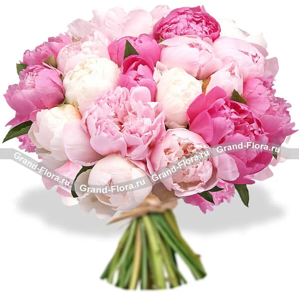 Стандартный (На фото): пионы розовые - 5 шт., лента белая.