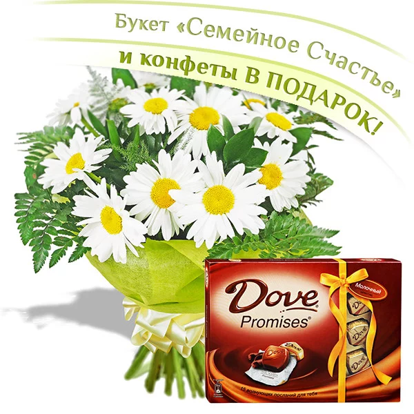 15 ромашек: ромашка белая - 15 шт, салал, триферн - 3, папоротник - 5 шт, фетр зеленый, конфеты "Dove promises".