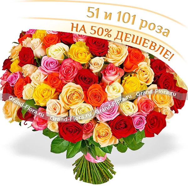 101 роза: роза разноцветная (40см), лента розовая.