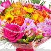 Хризантема ромашковая фиолетовая - 9 шт., гербера оранжевая - 5 шт., гербера желтая - 4 шт., роза розовая - 6 шт., роза оранжевая - 5 шт., альстромерия оранжевая - 6 шт., альстромерия розовая - 6 шт., хризантема одноголовая зеленая - 6 шт., лист рабелини - 5 шт., натуральная упаковка розовая, бант в тон.